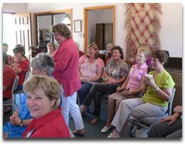 Palerang Council received a grant from the NSW Office for Women's Policy in the NSW Department of Premier and Cabinet for a local event to celebrate International Women’s Day 2010. The Council asked the Wonderful Women of Wamboin to host a celebratory luncheon. Early on Monday 8 March volunteers began to appear at the Wamboin Community Centre to creative a festive venue. White draped tables were decorated with greenery and fresh flowers. Hand crafted wall hangings of rural scenes, more greenery and bouquets of colourful zinnias and roses decorated the room. Next the volunteer chefs arrived with a luncheon of cold roast chicken and salads of many types.